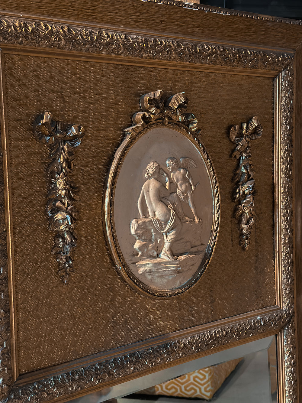 Prachtige, antieke Franse spiegel met sierlijk uitgewerkte details. Een echte blikvanger met karakter. Door de jaren heen zijn er wat beschadigingen ontstaan, wat bijdraagt aan de authentieke uitstraling.