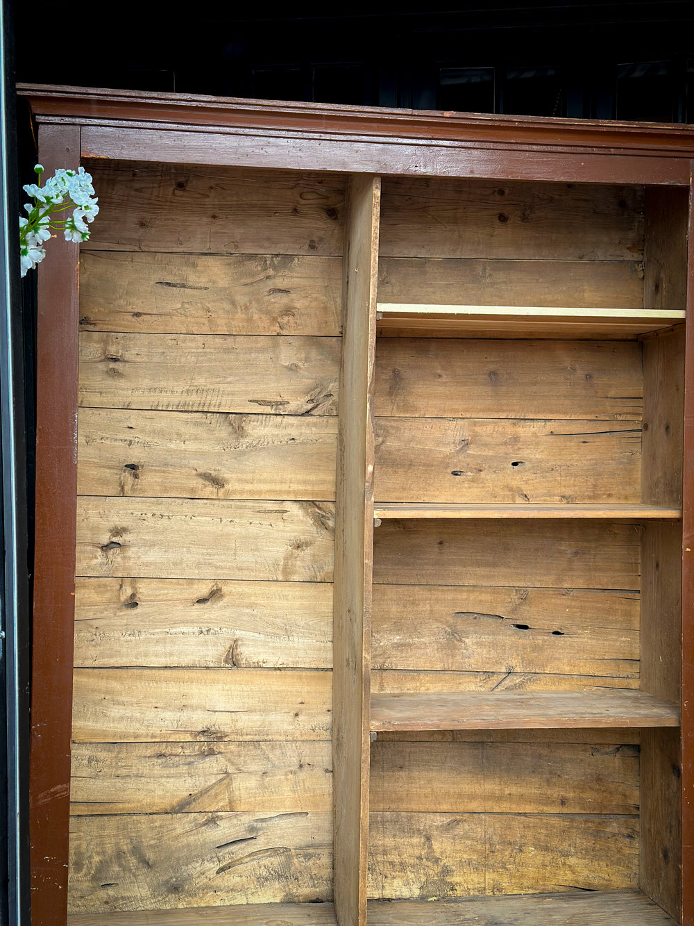 Deze robuuste vintage vakkenkast (165 cm breed × 208 cm hoog × 49 cm diep) straalt karakter en geschiedenis uit. Gemaakt van doorleefd hout met een warme, authentieke uitstraling. De kast heeft meerdere legplanken en één groot open vak aan de linkerkant – ideaal voor boeken, decoratie of een opvallend woonobject.