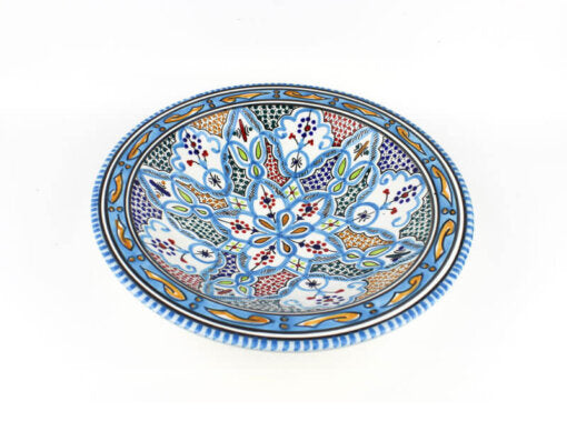 Deze handgemaakte Tunesische schaal op voet (30cm) is perfect als presentatieschaal. De verhoogde vorm en het ambachtelijke ontwerp geven elk stuk een unieke uitstraling. Verkrijgbaar in verschillende kleuren en motieven.