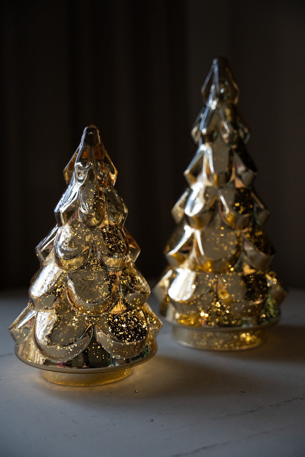 Beide kerstboompjes zijn gemaakt van glas en voorzien van warme gouden verlichting  ideaal voor een luxe, sfeervolle kerstdecoratie in huis of winkel.