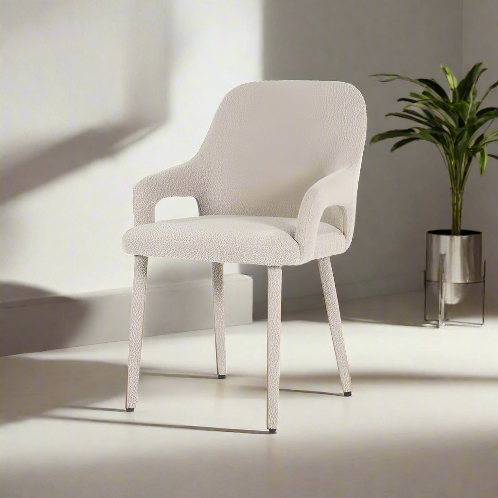 • Hoogwaardige bouclé-bekleding: de zitting en rugleuning zijn bekleed met zachte bouclé-stof in een warme tint. Hierdoor ontstaat een uitnodigende uitstraling die gemakkelijk past bij verschillende interieurstijlen.