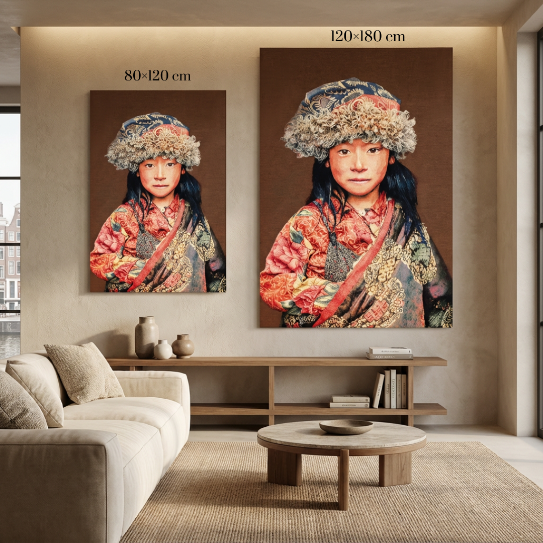 Tibetaanse Meisje Taupe – Geweven Gobelin Wanddecoratie Zonder Lijst