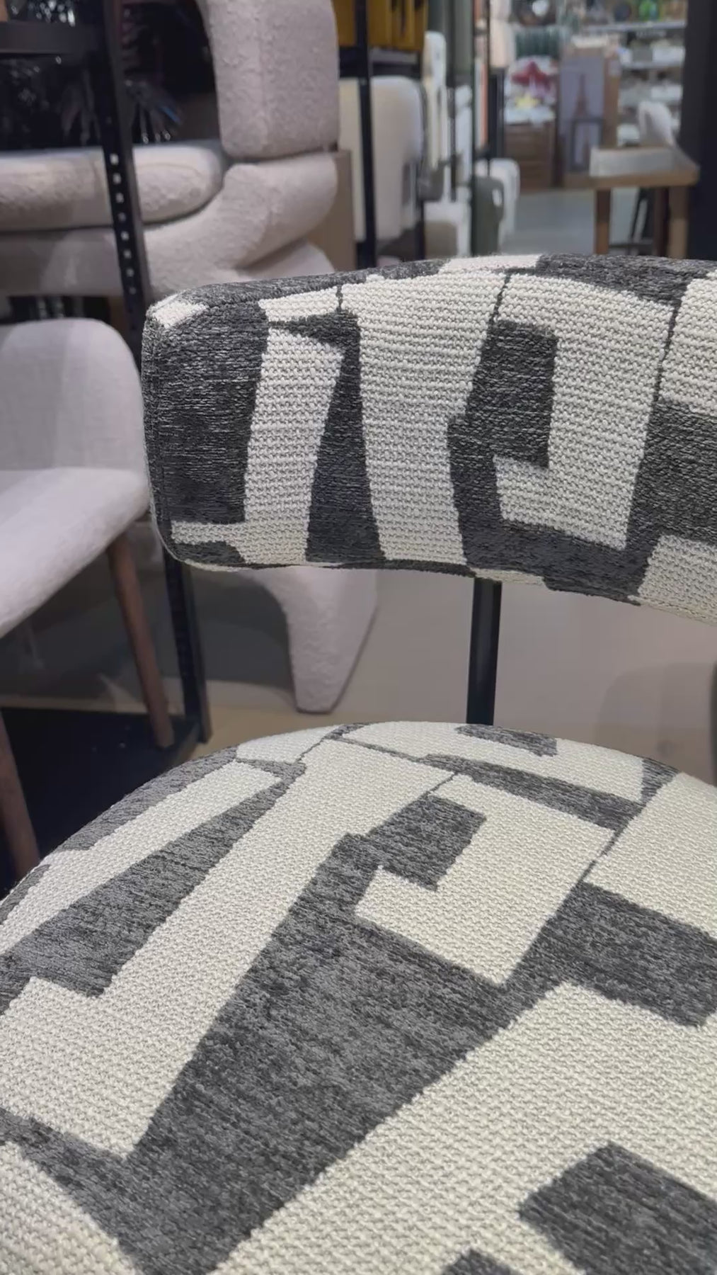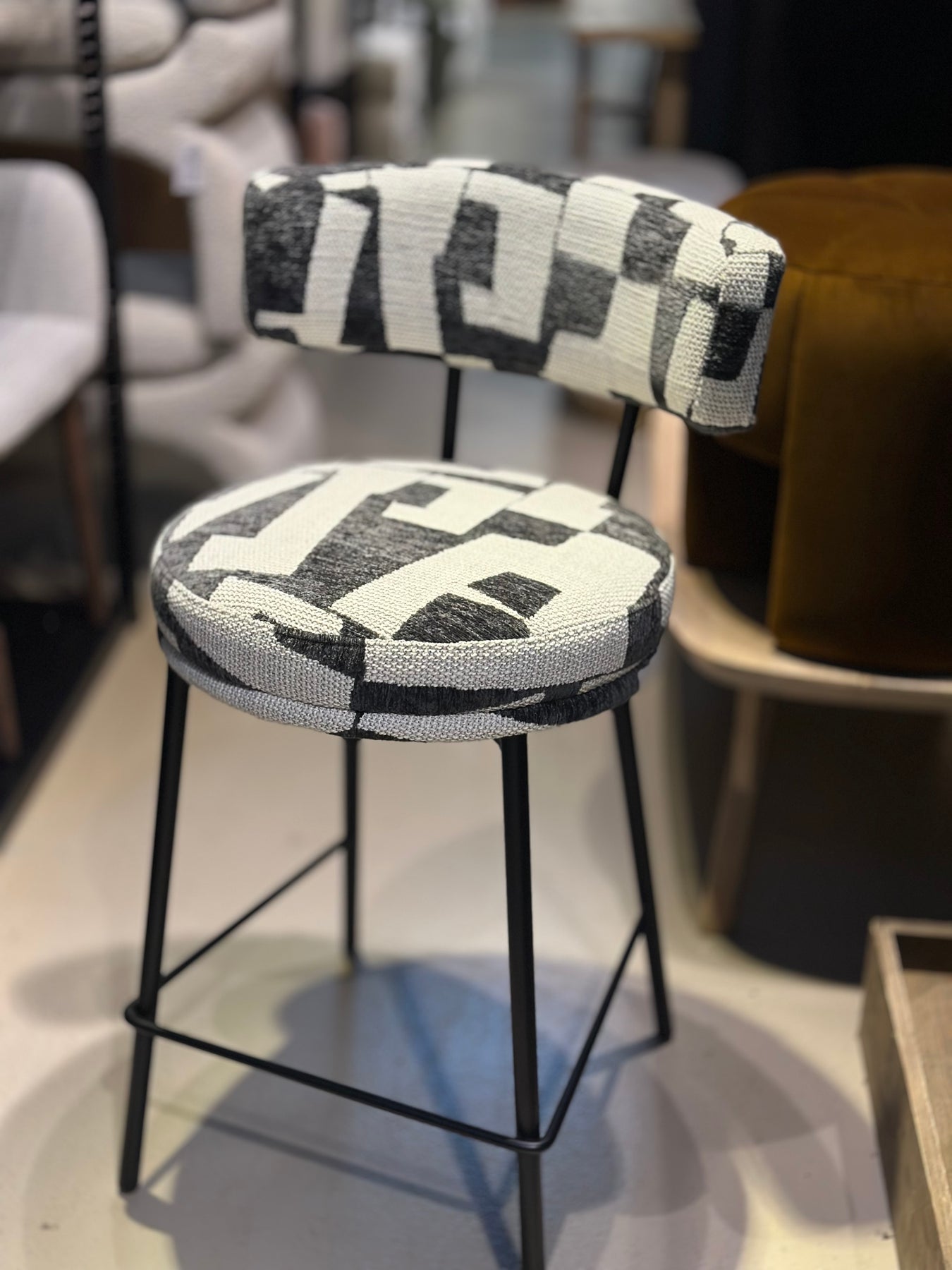 Bar kruk Vita – een moderne barkruk met opvallende zwart-wit bekleding en een comfortabele ronde rugleuning. De stevige metalen poten zorgen voor stabiliteit en een stijlvolle uitstraling.
