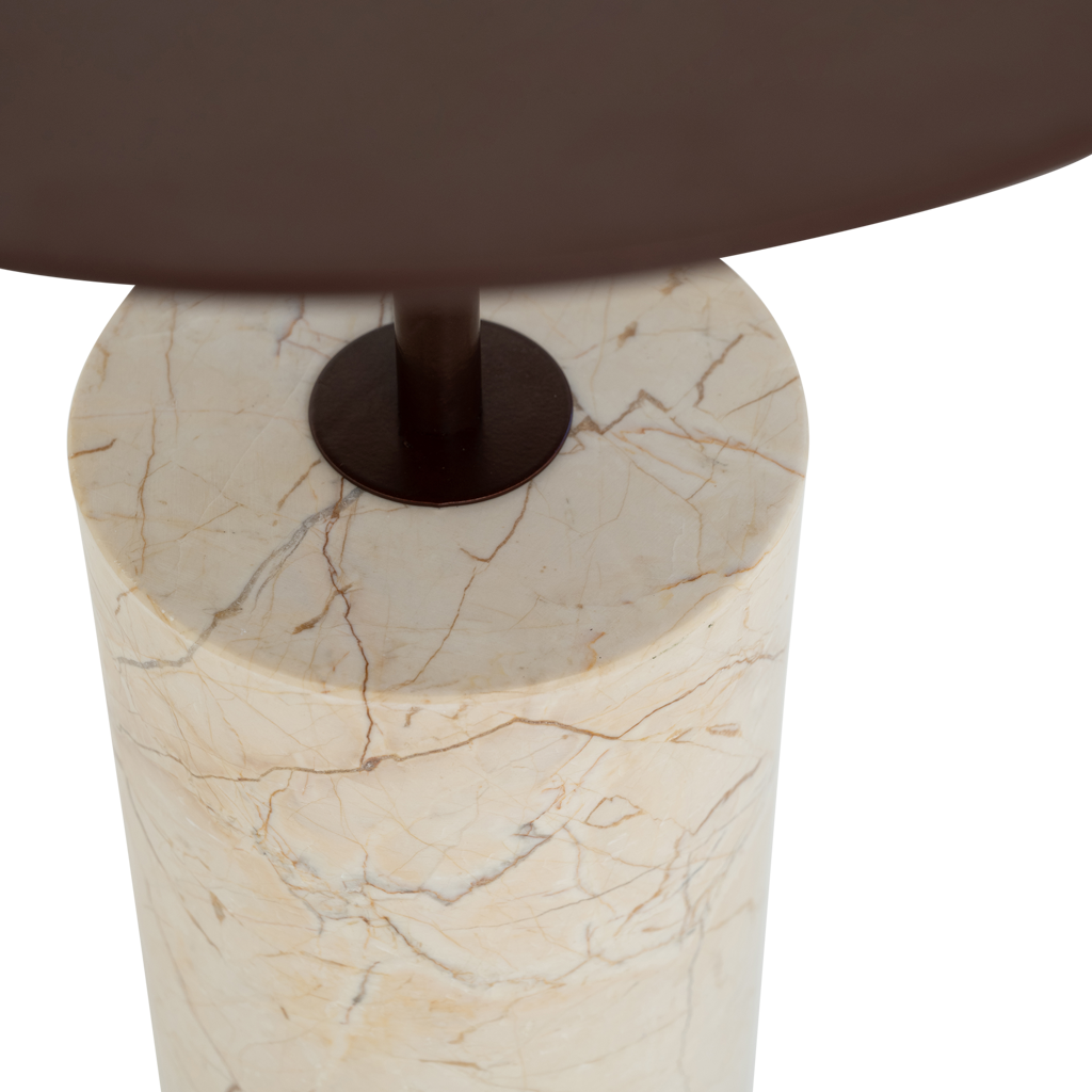 Elegancy makes a great match with minimalism, as Urban Nature Culture’s side table Macy shows. It stands tall and proud in any living room, besides your favourite armchair or as a night stand. Whether you’ve got a tiny house or just love minimalistic interiors, side table Macy B fits anywhere and makes it easy to switch up your furniture. This side table combines a matte, sofia marble leg with a red & brownish metal table top – all in a clean, modern design that finds luxury in simplicity. It easily pairs with other items in your interior; a figurine, flower vase or even that daily Good Morning cup of coffee. A sophisticated beauty with a strong design – it blends in but stands out all the same. Care instructions: clean with a dry cloth.