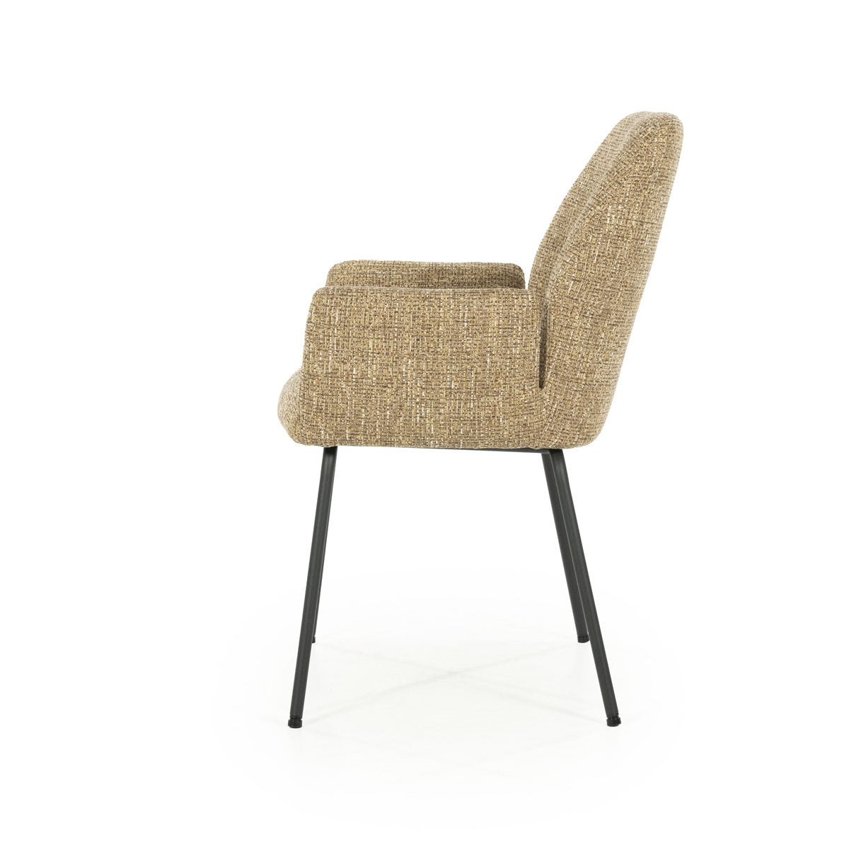 De stoel Indy is een comfortabele stoel met een zitting van stof en een onderstel van gecoat metaal. De mosterdkleurige zitting geeft de stoel een warme en opvallende uitstraling. De stoel is geschikt voor gebruik aan de eettafel of in een werkkamer.
