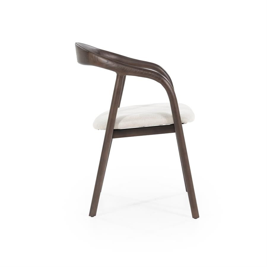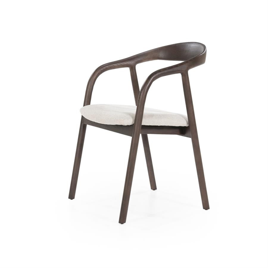 De stoel Rayven combineert comfort met een tijdloos design. De stoffen zitting in de stofsoort vormt een warme match met het gelakte essenhouten frame. Dankzij de ergonomische zitdiepte en armleuningen biedt deze stoel uitstekend zitcomfort, ideaal voor de eetkamer of als stijlvolle accentstoel in de woonruimte.