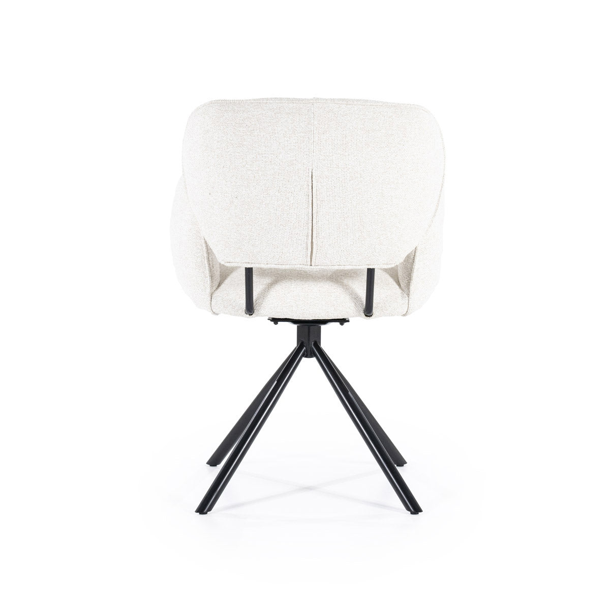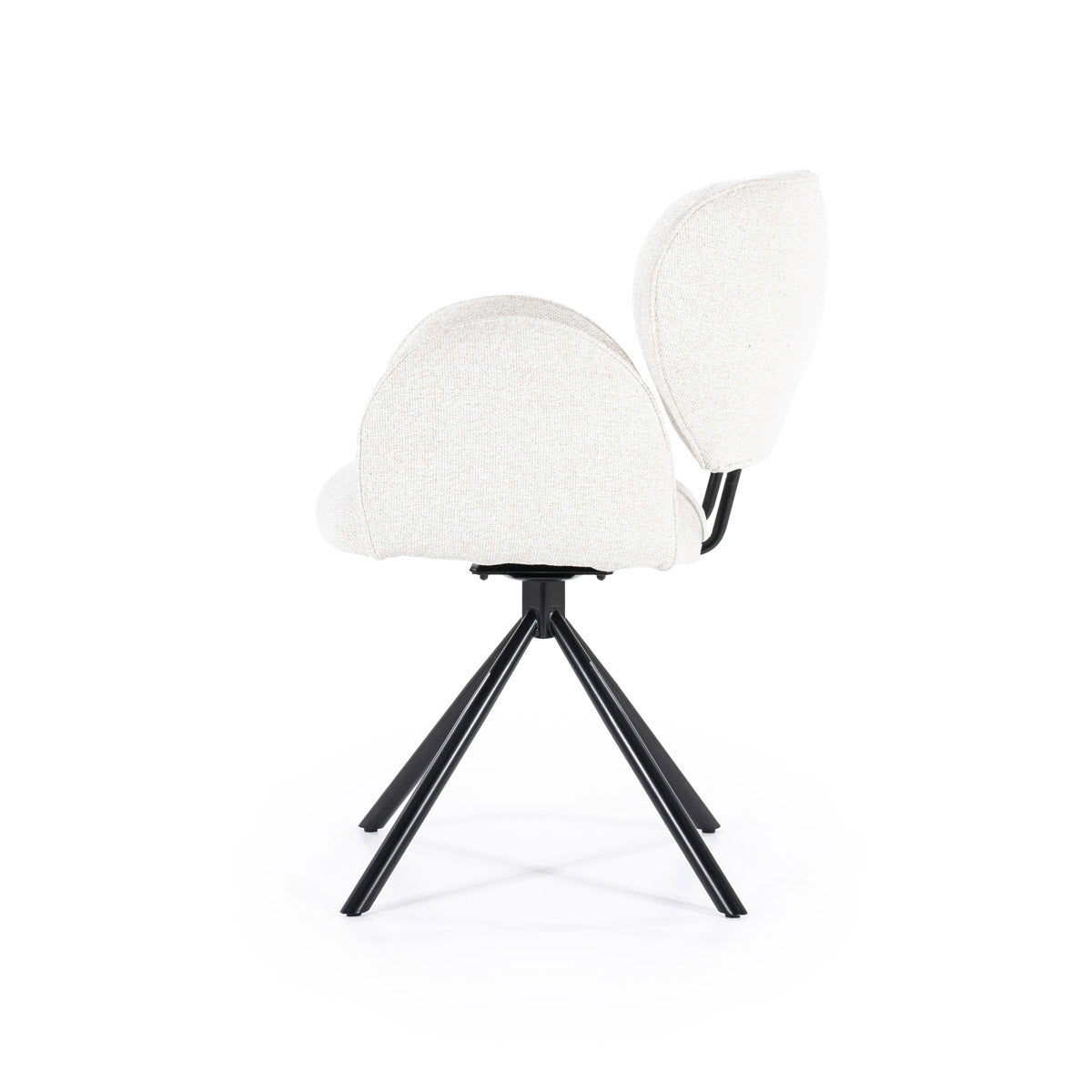 De stoel Rosalin is een draaibare stoel met een zitting van stof en een frame van metaal. De beige kleur geeft de stoel een lichte en neutrale uitstraling. Door het compacte formaat is de stoel geschikt voor gebruik aan de eettafel of in een werkkamer.