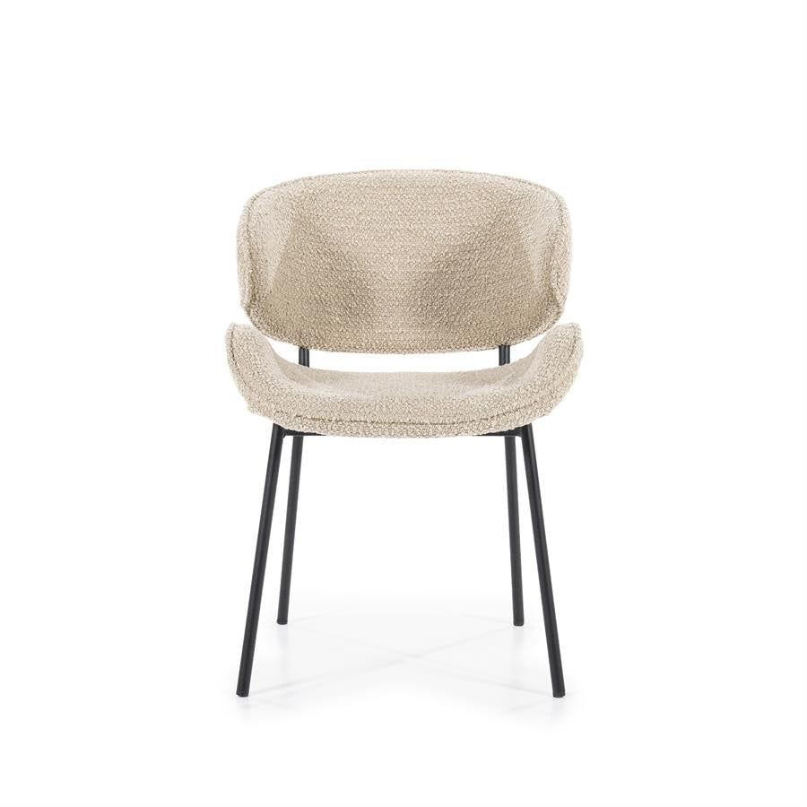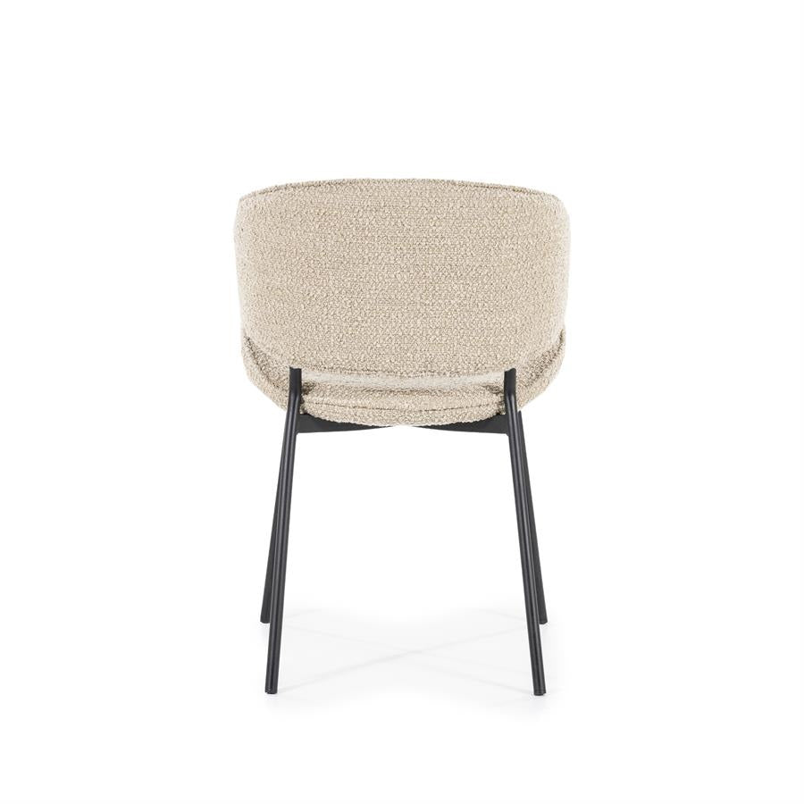 De stoel Tess is een comfortabele en duurzame stoel voor dagelijks gebruik. De zandkleurige stoffen zitting geeft een natuurlijke en lichte uitstraling, gecombineerd met een gecoat metalen frame voor stabiliteit en een lange levensduur. Ideaal voor de eetkamer, werkplek of als extra zitplek in huis.