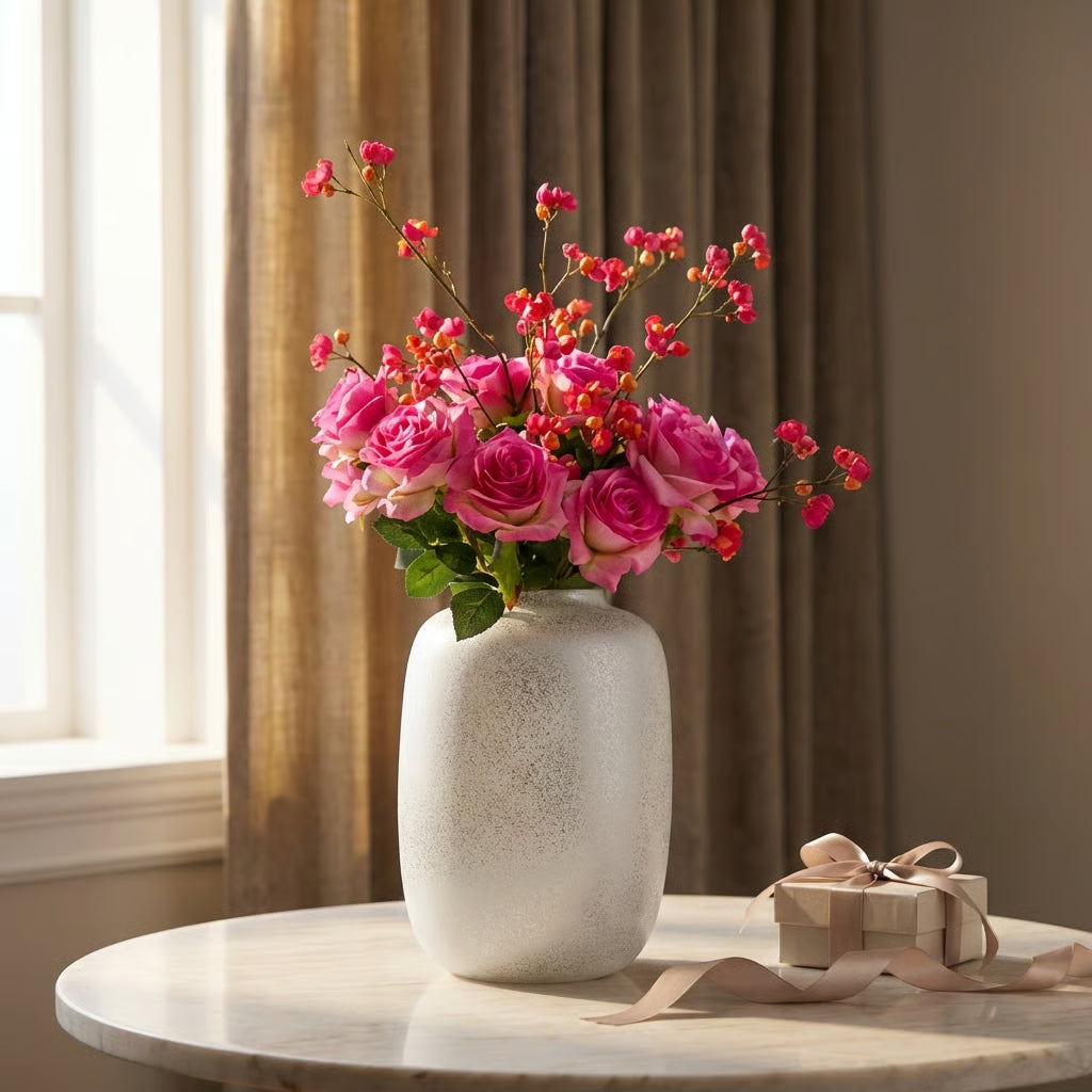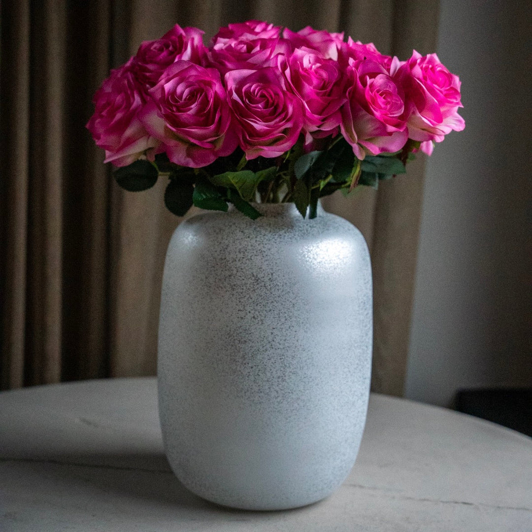 Zijden Valentijnsboeket met Artic Sparkle Silver Vaas