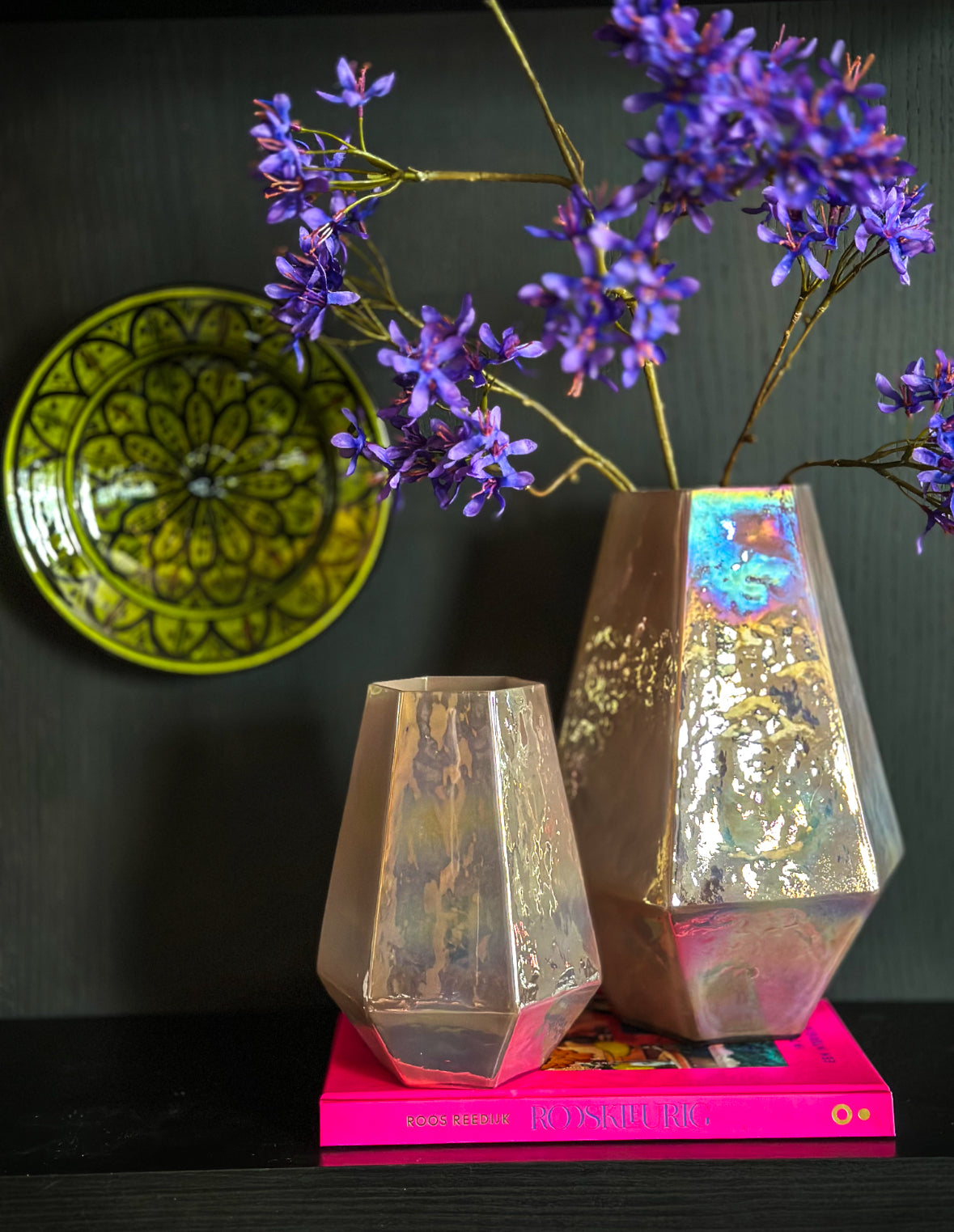 Strakke, moderne vazenset in zacht poederroze met luxe glans. Perfect als decoratie, voor droogbloemen of takken. Dankzij de geometrische vorm zijn ze echte blikvangers in elk interieur.