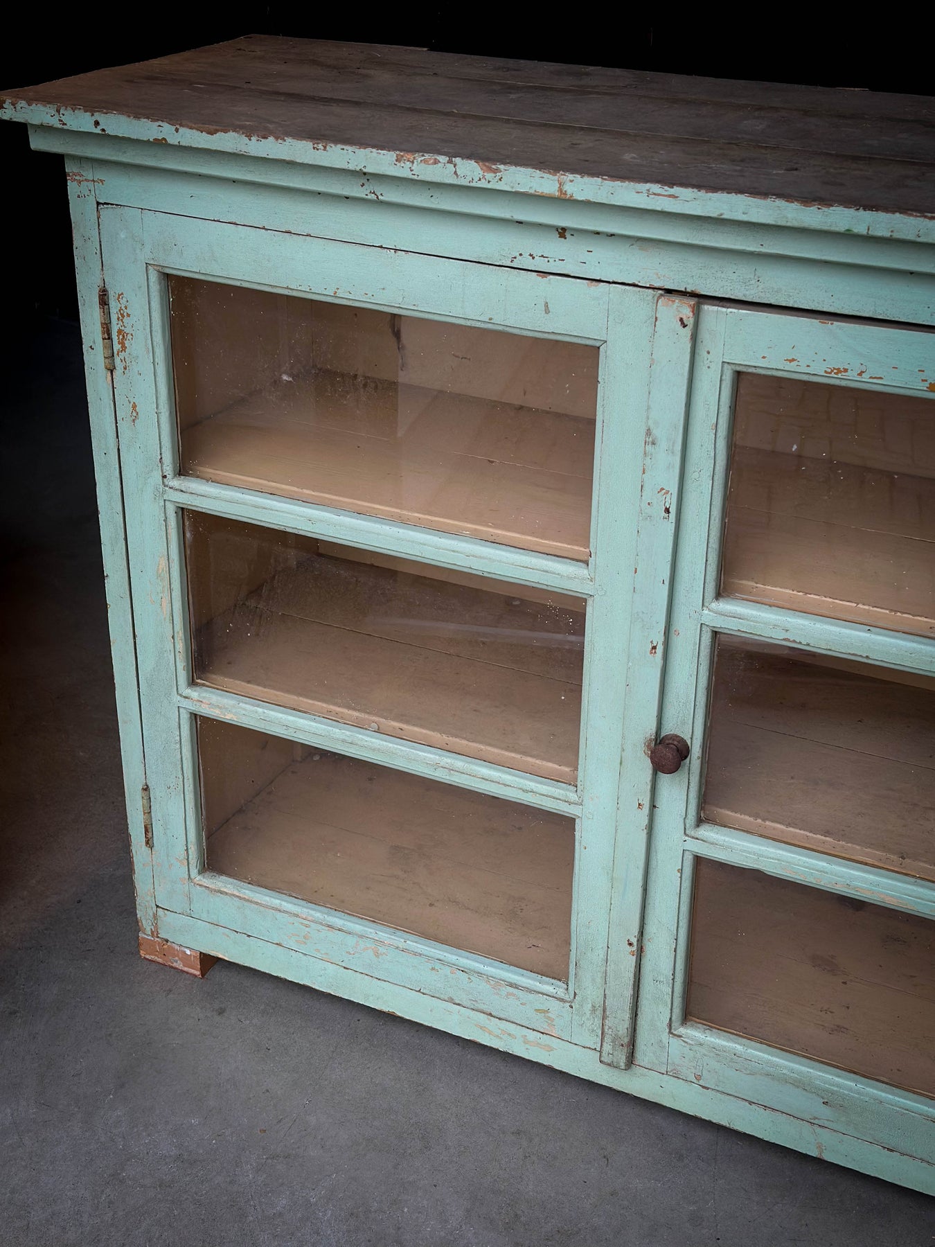 Frans brocante vitrinekastje in een prachtige verweerde mintgroene kleur. Deze charmante kast heeft twee glazen deuren met houten legplanken, perfect om je mooiste servies, boeken of verzamelstukken in te tonen. Het verweerde hout en de authentieke uitstraling geven dit meubel een warme, vintage sfeer.
