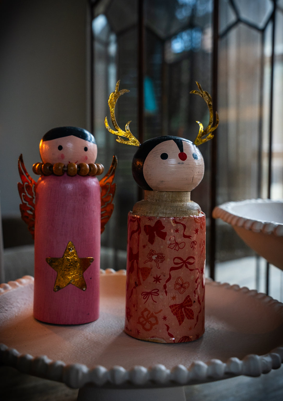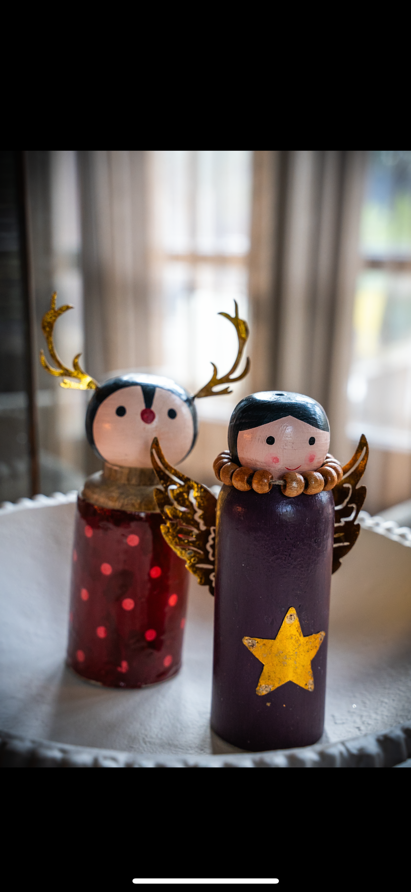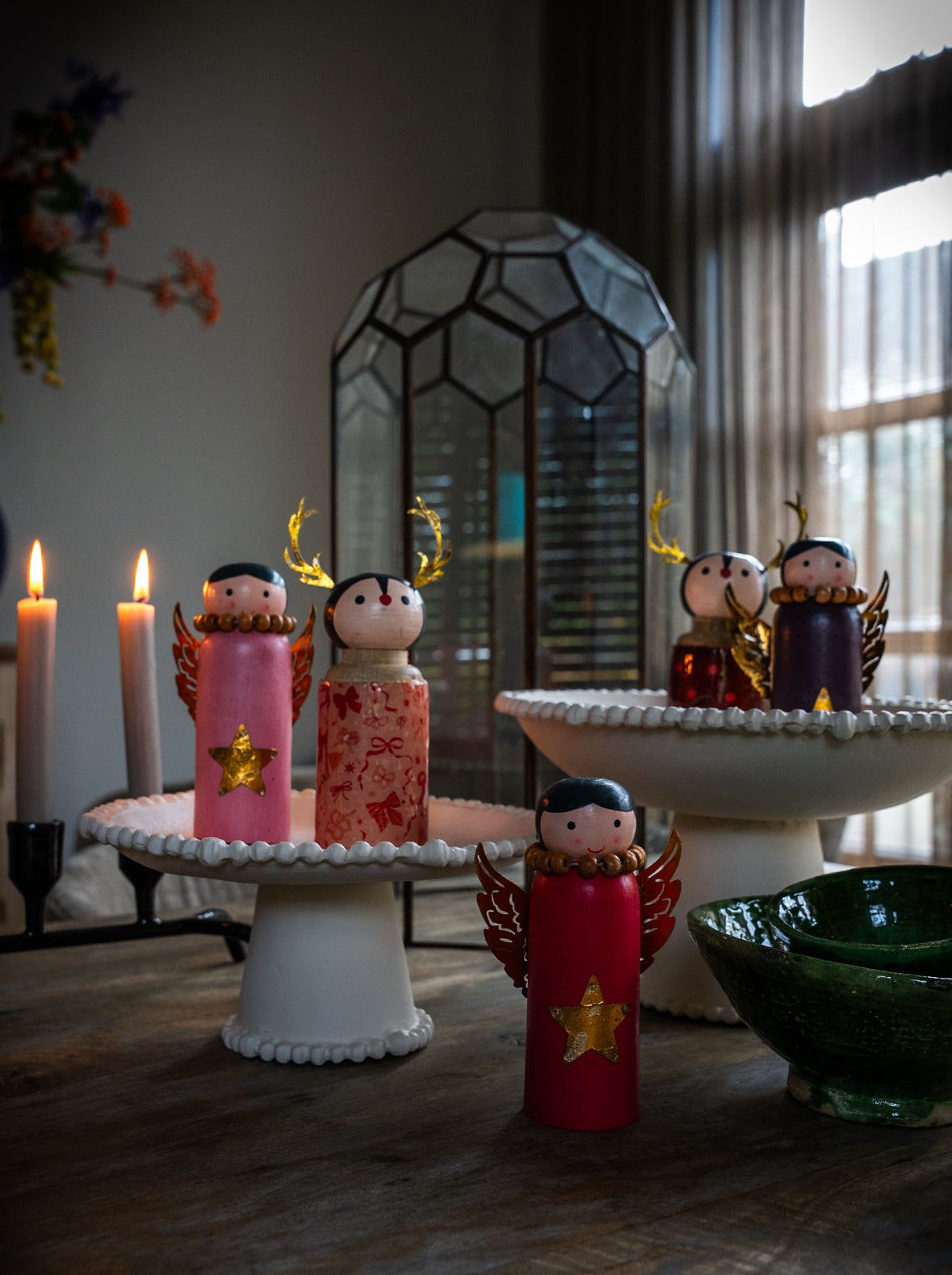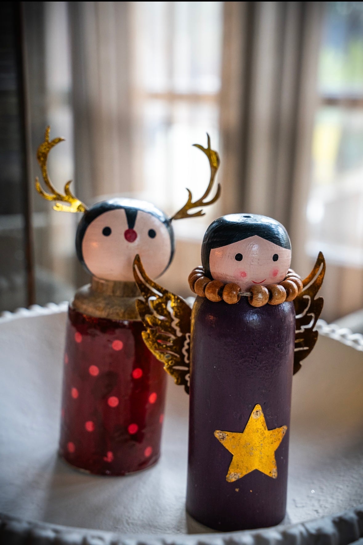 Breng warmte en magie in huis met deze handgemaakte houten kerstengeltjes en rendieren. Elk stuk is met zorg beschilderd en afgewerkt met fijne details zoals gouden sterren, vleugels en gewei. Perfect voor op tafel, dressoir of vensterbank en prachtig om samen te combineren voor een sprookjesachtig geheel dat je elk jaar weer kunt neerzetten.